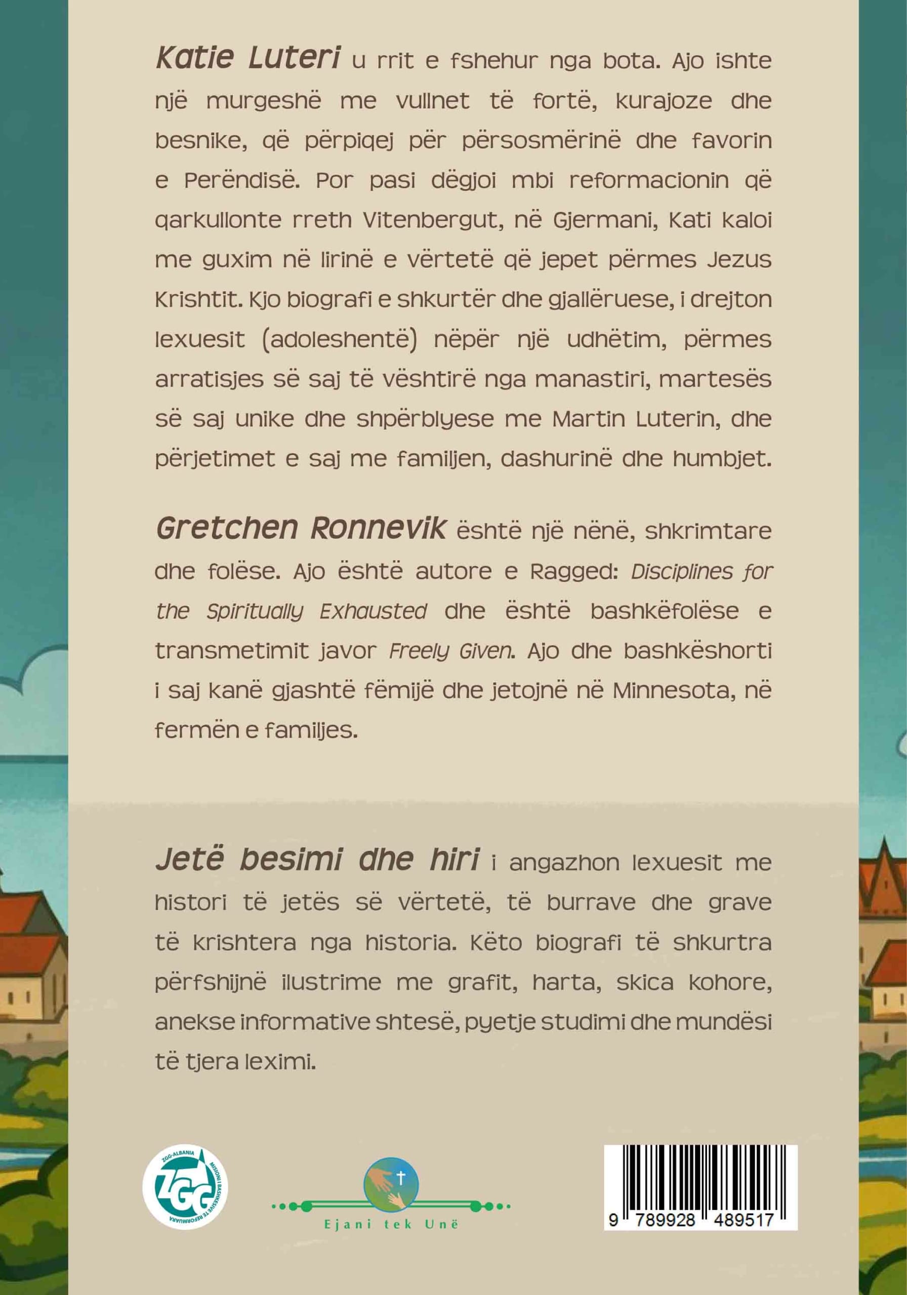 Katie Luteri u rrit e fshehur nga bota. Ajo ishte një murgeshë me vullnet të fortë, kurajoze dhe besnike, që përpiqej për përsosmërinë dhe favorin e Perëndisë. Por pasi dëgjoi mbi reformacionin që qarkullonte rreth Vitenbergut, në Gjermani, Kati kaloi me guxim në lirinë e vërtetë që jepet përmes Jezus Krishtit. Kjo biografi e shkurtër dhe gjallëruese, i drejton lexuesit (adoleshentë) nëpër një udhëtim, përmes arratisjes së saj të vështirë nga manastiri, martesës së saj unike dhe shpërblyese me Martin Luterin, dhe përjetimet e saj me familjen, dashurinë dhe humbjet.